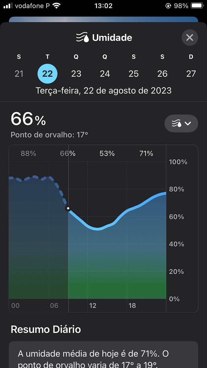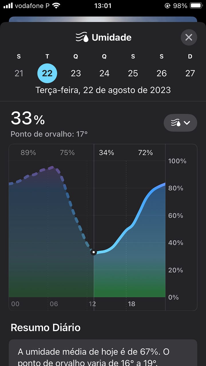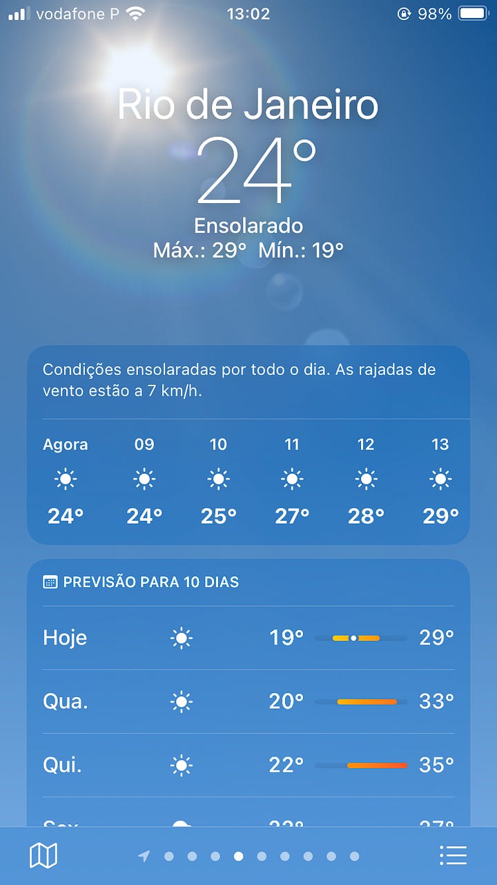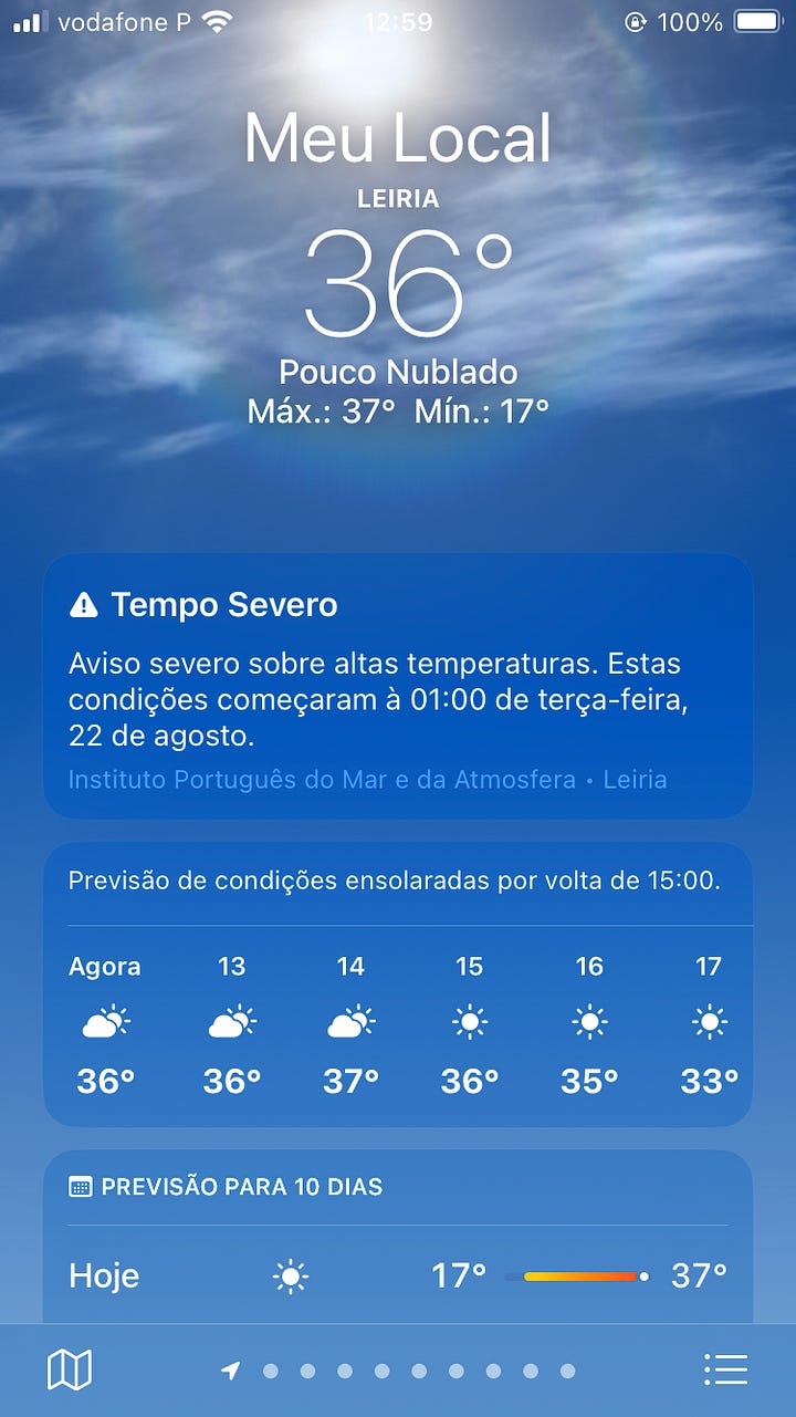 Sério. O calor daqui é incomparável. Meus 30 anos de RJ não são páreos pros três meses de verão português. Porque além de quente, o tempo tá muito seco. Eu coloquei uma roupa pra secar meio dia e uma da tarde já tava esturricada. Não tem a menor condição. Coloquei os prints do app de meteorologia pra vocês terem uma noção da situação deplorável. Mais do que nunca, se eu pudesse, atendia meus anseios infantis e me alimentaria única e somente de sorvete, porque é a única coisa que dá pra comer sem querer morrer depois.